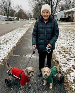 They’re small dogs, both under twenty pounds, both unable to use their back legs. Pearl was hit by a car before I found her. Buddy was born the way he is. A rescue group fitted them with little wheel carts, and those wheels changed everything.