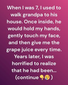When I was seven years old, visiting my grandfather felt ordinary in the way childhood often turns routine into comfort without explanation. Every week, I would meet him at the corner store, where he waited patiently, hands folded, eyes scanning the street until he saw me. I believed my role was important: I was there to walk him home. He let me lead, matching his slow steps to mine, trusting me completely. At the time, I thought it was a game or perhaps a small responsibility he enjoyed giving me. His house sat quietly at the end of the street, unchanged and modest, smelling faintly of old books and clean laundry. Once inside, the same ritual unfolded every visit. He would take my hands in his, lift his gaze to my face, and study me with an intensity that felt both serious and gentle. Then he would smile, wordlessly, and pour us each a glass of grape juice. We would sit together in silence, the quiet never uncomfortable, his presence wrapping around me like reassurance.
