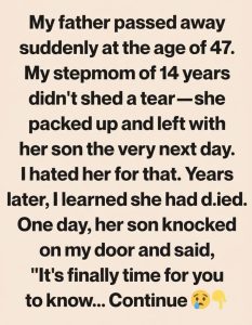 My father died when I was still young enough to believe that the people you love most are supposed to stay forever. One day he was there, filling the house with his laughter and clattering dishes in the kitchen, and the next day I was standing in a black dress that didn’t quite fit, listening to adults whisper words like “sudden” and “unexpected.” I remember staring at his coffin and waiting to feel something dramatic, something that matched the weight of the moment, but instead there was only numbness. What I remember even more clearly, though, is what happened after the funeral. My stepmother, who had been part of my life for fourteen years, moved through the house like a ghost. She didn’t cry in front of anyone. She didn’t collapse or wail or cling to photographs. The morning after we buried my father, she packed her bags, took her son by the hand, and walked out the door without a single explanation. No goodbye, no hug, no promise to call. I stood frozen in the hallway, watching the woman I thought of as family disappear, and in that moment something hardened inside me.